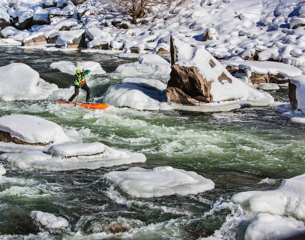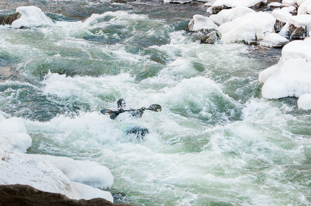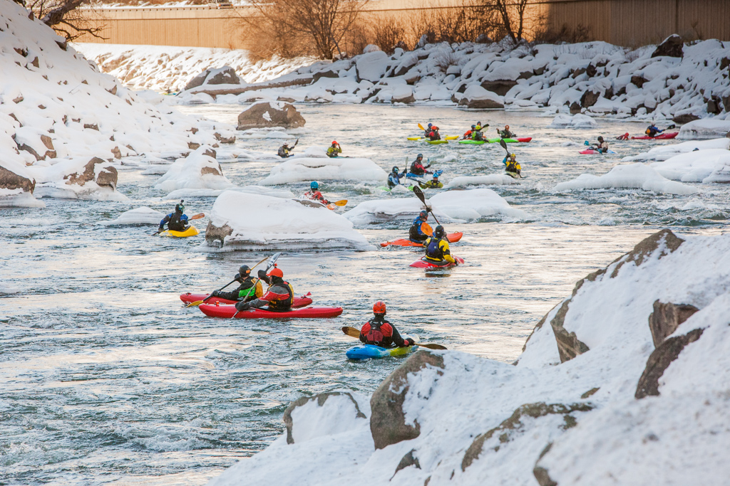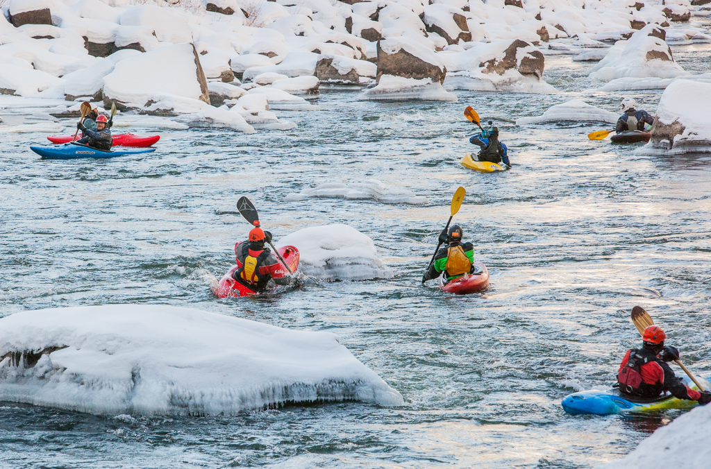 The boat ramp is a chaotic flurry of activity as paddlers fumble with wooden fingers and frozen gear. One by one, the kayakers slide down the snow covered boat ramp and splash into the semi-frozen river. They pick their way through snow covered rocks in the river that resemble white-frosted cupcakes. The colorful boats glisten against the stark winter landscape like Christmas lights on a tree. Triumphant calls of delight echo up and down the riverbed at regular intervals. It is truly a celebration worthy of the genesis of a new year.