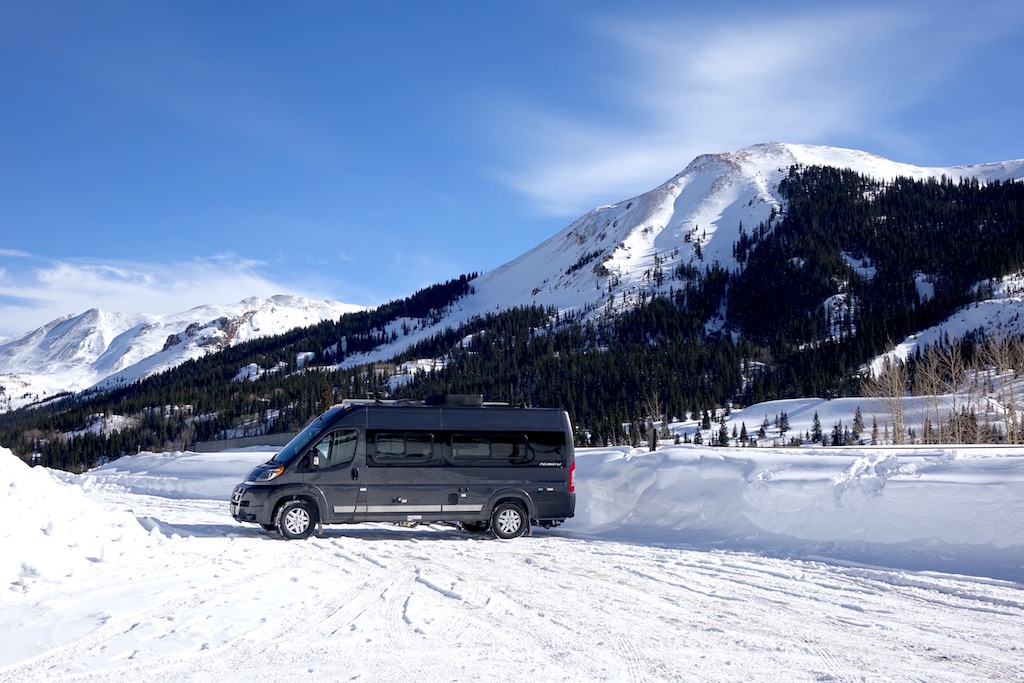 We aligned the Travato next to a snow bank in front of us with the mountains in the background. Peter set up his camera with a tripod low to the ground about 50 feet away. Behind us was a six to eight foot mound of plowed-up snow.