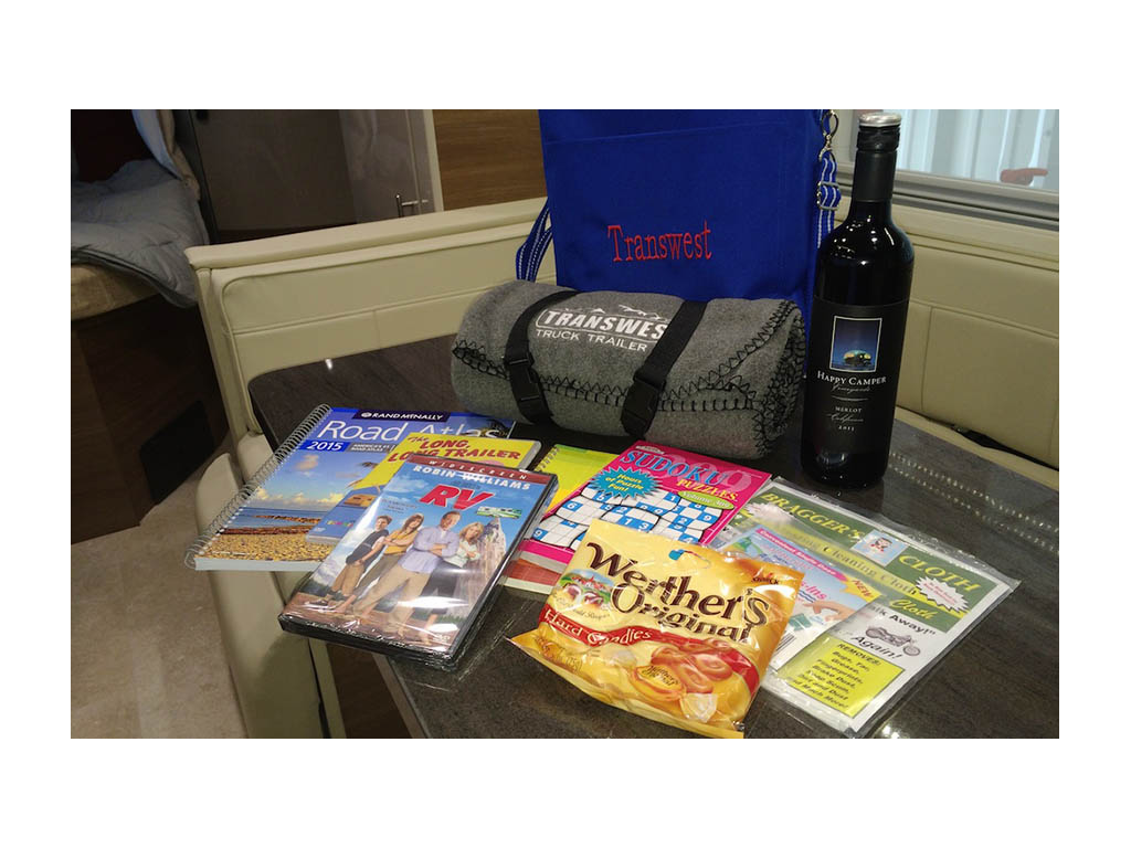 Starting off right. A very thoughtful gift from Transwest including a surprisingly good Merlot labeled "Happy Camper."