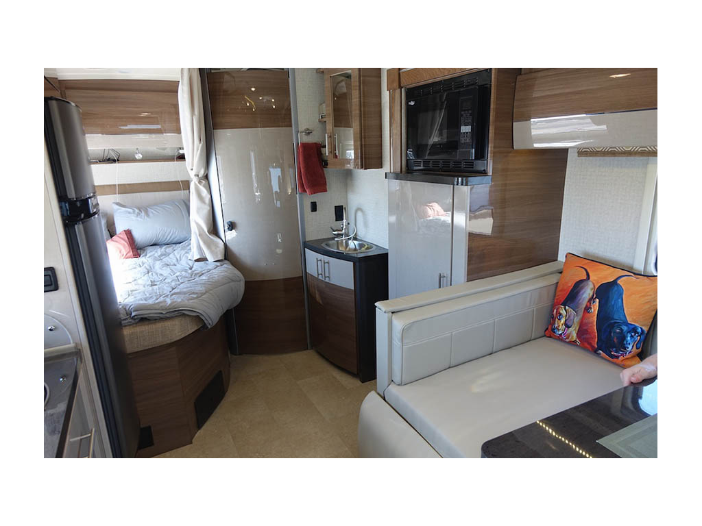 First of all, we solved the bed making with a combination comforter and sheet system that is essentially a fancy sleeping bag. I’m 5’ 11” and it was great not having my feet touch a bulkhead wall like they did in our V because the J bed is 80” long. As I usually get into bed after Terry is asleep (on the shorter inside position), I barely disturb her as I crawl into the outside position. At home, we sleep on a queen sized bed and the J is more like a super full sized mattress, but after our first three-week trip, we both concluded that the bed was both comfortable and easy to deal with. Our home mattress is a TempurPedic and while the standard Winnebago mattress isn’t that fancy, the quality of the foam and additional tufting was a noticeable improvement over pure foam slabs. Newer models can be equipped with the Froli spring system which are some unique lightweight spring panels that add another level of comfort.