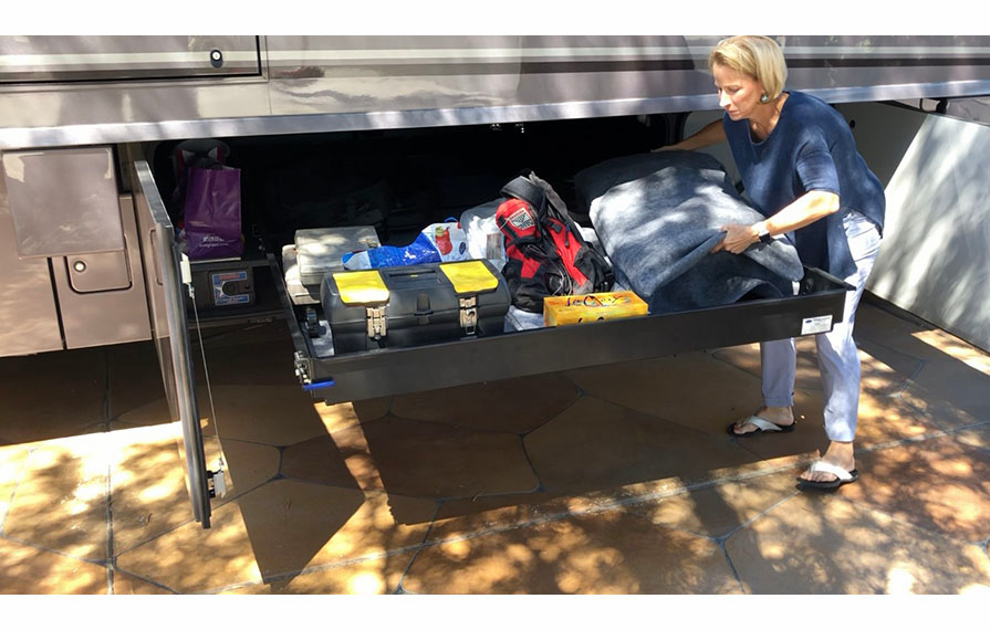 Diesel pushers in general have lots of “basement” storage. On the Horizon, there are 5+ storage compartments. The “plus” comes from a couple of bays that have mechanical equipment, but also good storage cubbies. At the heart of the Horizon basement storage is a double-wide bay with a roll-out tray that can be accessed from either side of the coach. I haven’t seen this kind of wide storage in other, far more expensive, coaches and it’s due to Winnebago’s custom Maxum chassis which lowers the coach rails, improves center of gravity, and allows for this super-wide storage drawer that has even more fixed storage below and on the side. It’s pretty impressive.