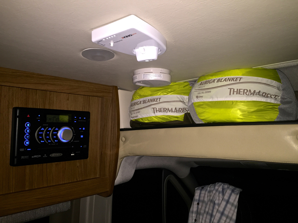 There's a storage bin over the cockpit, large enough for small items. I keep binoculars up there within reach, owners manuals, the window coverings, sleeping bags, and sometimes the second bed pads.