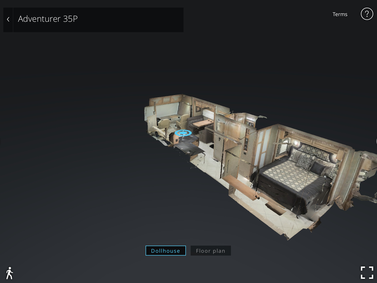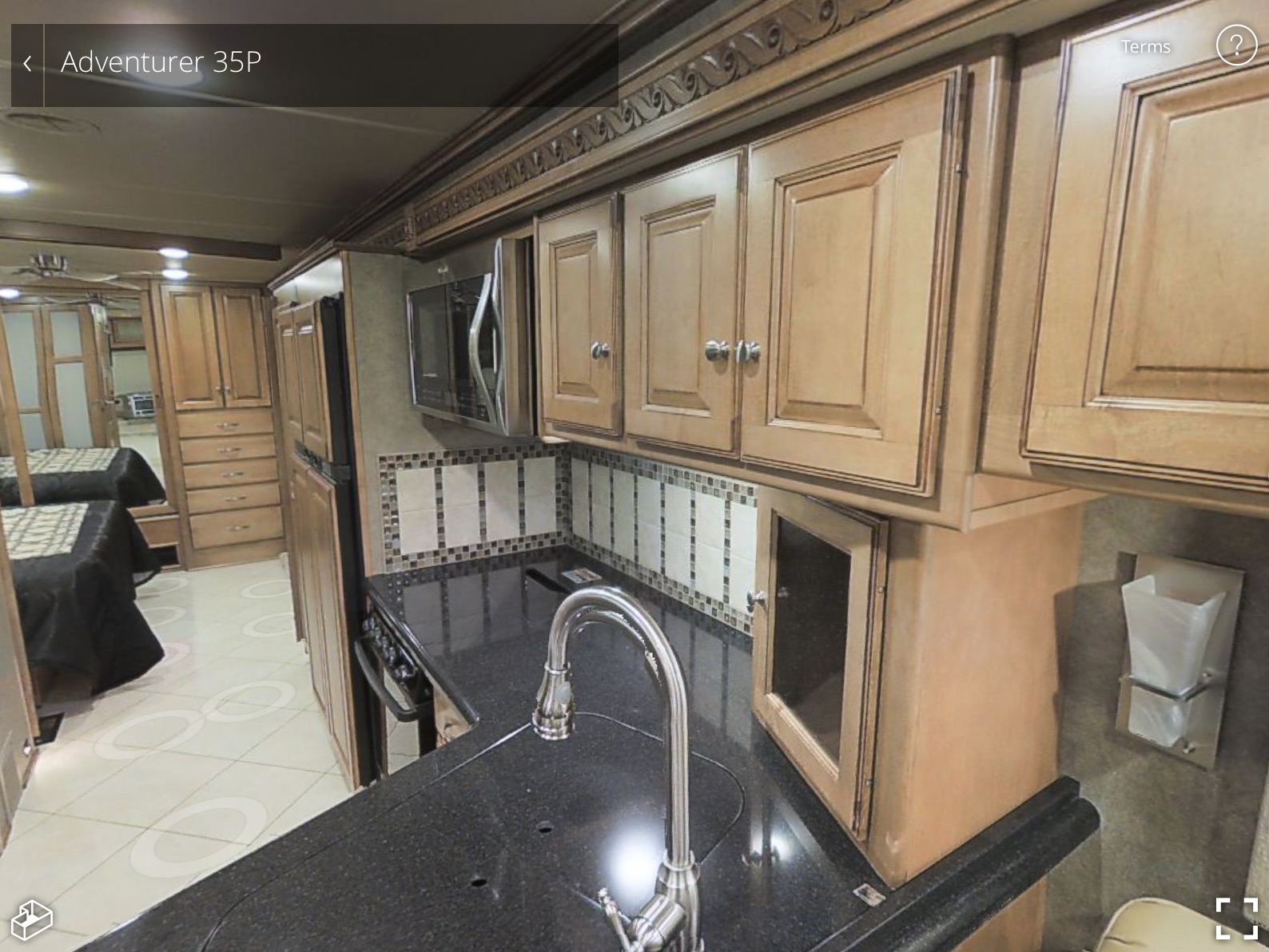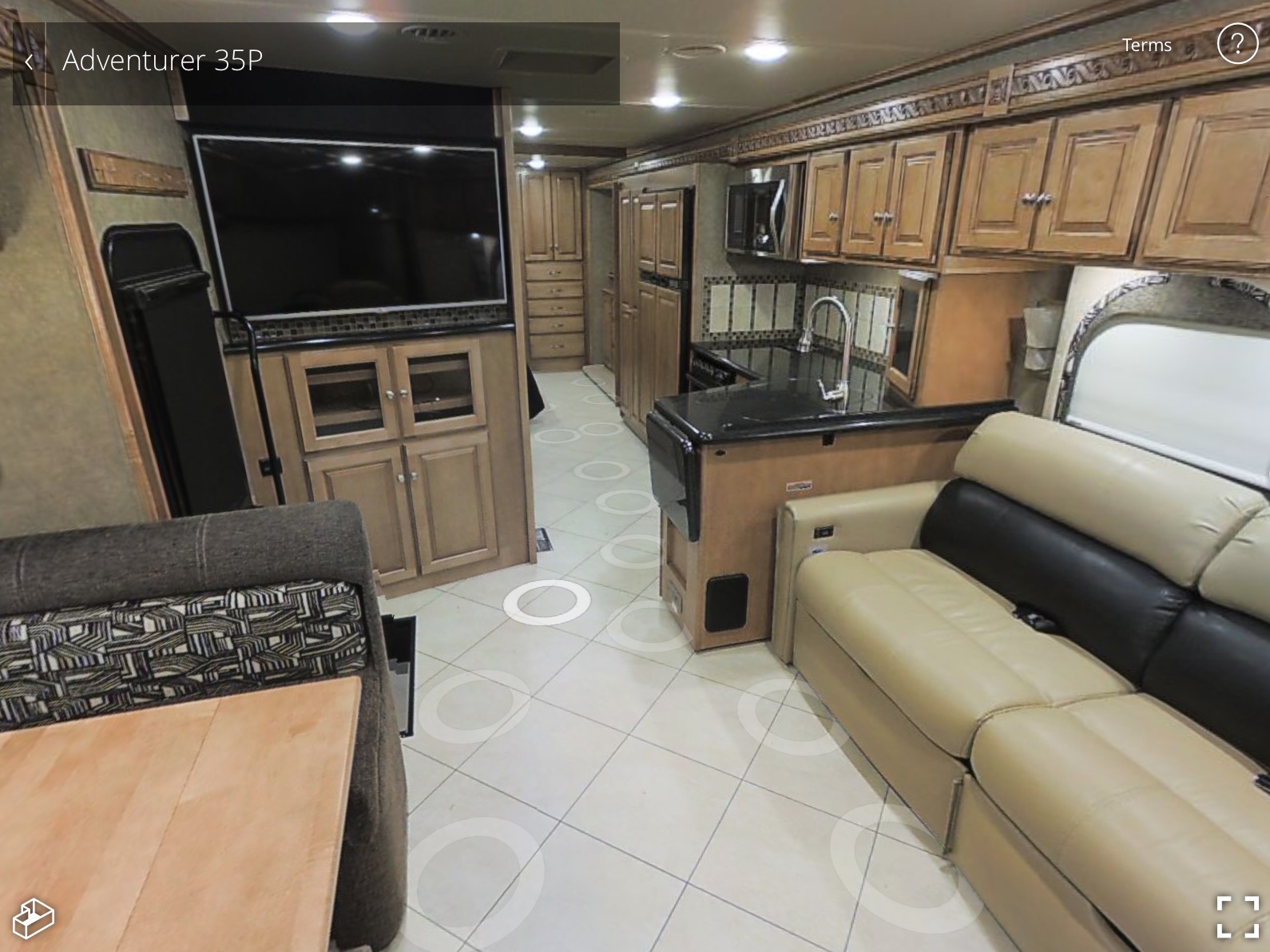 Today, there are over 20 coach interiors on the Winnebago product web site and the plan is to ultimately have 3D images of every available floorplan. When you're viewing a WinnVision image you'll see a series of circles. These are your navigation viewpoints and the actual location of where the scanning camera was placed. For a really impressive experience you can enlarge the image to full screen by clicking on the frame box in the lower right had corner. You can navigate through the image either with your arrow cursor keys or mouse/trackpad. If you're on a phone or tablet, simply tap and drag your finger.
