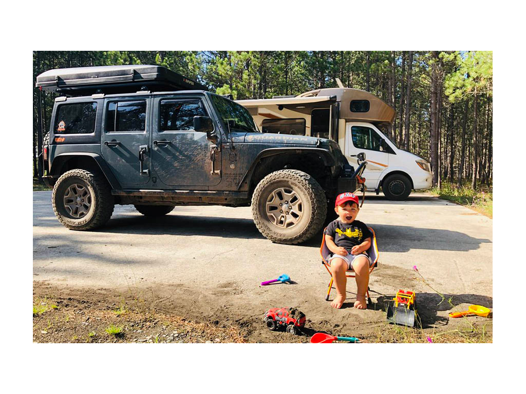 Let’s start with some toy talk. Because I don’t have the time (or extra water) to constantly be cleaning toys, my son Caspian has a collection of toys that are specifically for outdoor use. They live in a bay below our Winnebago View, and he can access them himself once we help open the door.