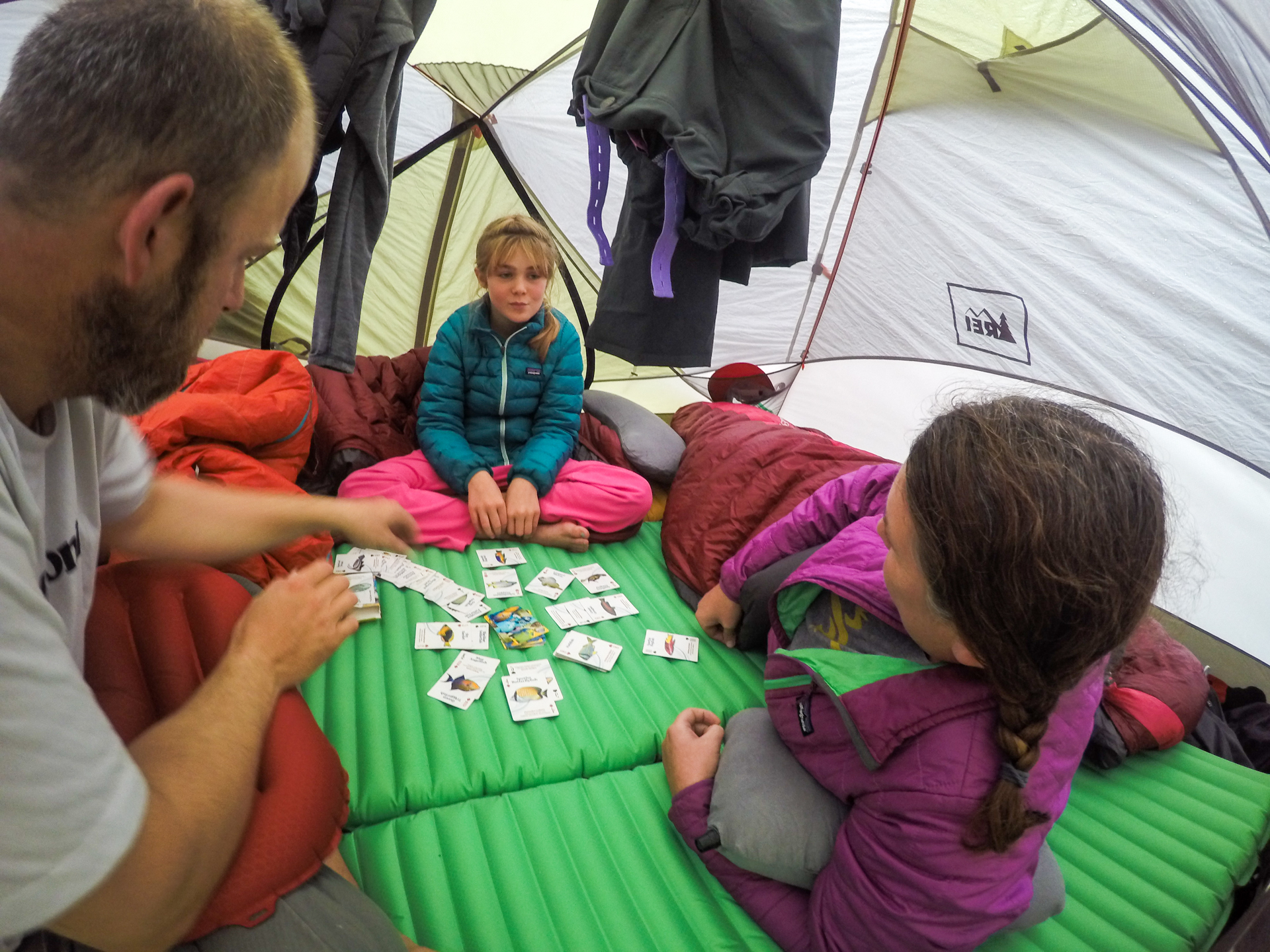 Day three arrived with cloudy skies, but thankfully no rain. We meandered for six miles over rolling terrain, through deep green tunnels of rhododendron, moss and fern - a temperate rainforest. Grateful for the cool, dry weather, we made quick work of the six miles and arrived at camp early in the afternoon. Our third and final camp was by far my favorite. Surrounded by old growth giant trees covered in moss and ferns, I felt as if we had stepped back in time to the Jurassic era. The nearby stream provided an endless of supply of cold water and a soothing background melody. We took our time cooking dinner and feasted on pesto salmon pasta and creme brulee - a dehydrated, yet delicious feast prepared by the chefs at Backpackers Pantry, and rehydrated by us. After dinner we again secured our backpacks from the nearby bear cables, and retired to our tent for another heated round of cards. Sleep again came quickly after a wonderfully active day. We awoke the next morning to discover that while the cables provide great protection from bears in the backcountry, they were no match for the rodent population that shared Camp 3 with us. With most of our food supply infiltrated, we set out on the last day of our adventure hungry and focused on the finish line.