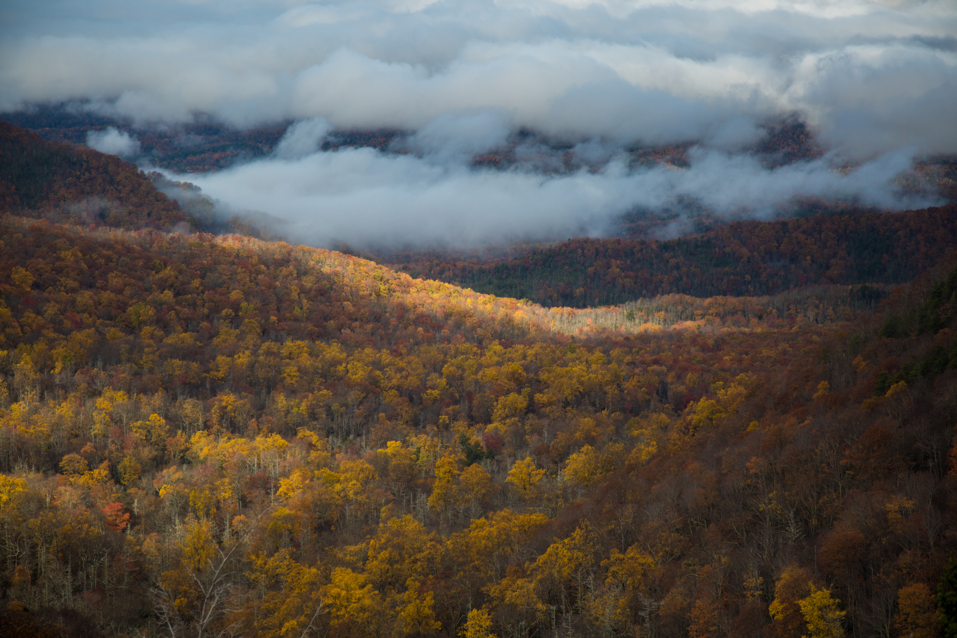 The changing of season from summer to fall, with it's brilliant display of foliage is a photographers dream, and something Peter looks forward to each year. It is the busiest time of year for our photography business, and a delicate balancing act of endless waiting (for the color to arrive), followed by a frantic sprint to capture the spectacle before it fades into the monochromatic doldrums of winter. This year, we were trying to time a four day backpacking trip to coincide with the peak of the turning leaves. When we arrived in Bryson City, North Carolina, we were at the very beginning of the shift of the color palette. There were sparse patches of gold intermingled within the verdant green that blankets the Appalachian mountains, but it was just the beginning of the metamorphosis, and we decided to wait, just a little longer, before we set off into the mountains.