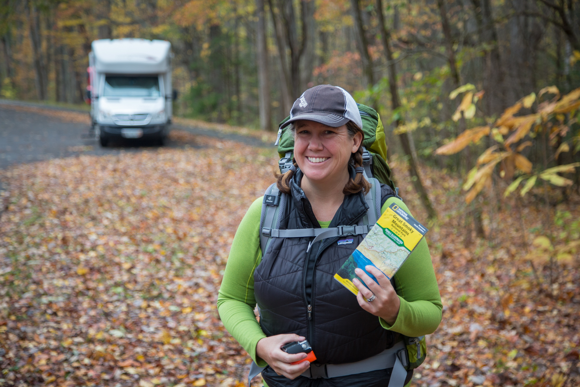 We continued on, descending into Gatlinburg (the starting point of our trip), ever hopeful that our timing was just right. After conferring with the park rangers in the backcountry office, we decided on a twenty mile backpacking loop in a more isolated area of Great Smoky Mountain National Park near the small town of Cosby, TN. We stayed at the Cosby Campground just inside the park boundary, and were ready to blast off on our adventure the next morning. That night, the wind howled rocking the RV and rattling the vents, and when we emerged from Winnie the View the next morning, we stepped into a knee deep river of red and gold that blanketed the roadway. With just a few stragglers holding tight to the branches overhead, almost all the leaves had fallen overnight.