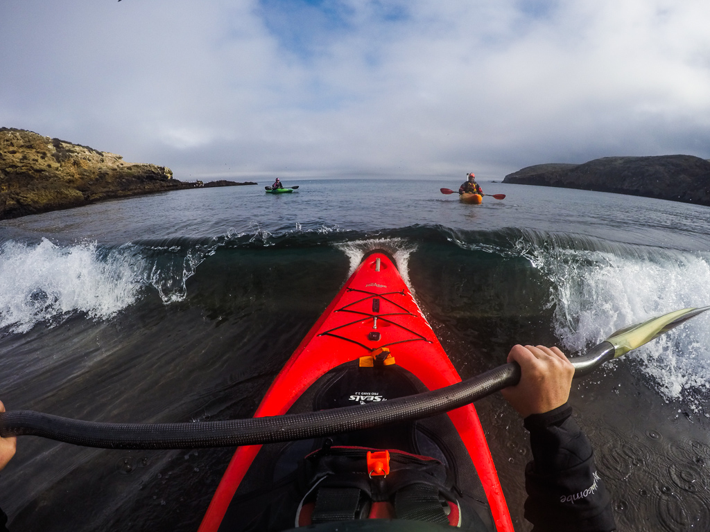 Back at camp, we threw together a quick lunch and then headed out for an afternoon paddle along the craggy cliffs. The sea was calm and the wind light, so we made our way into the open water that surrounds the island to see what we could see. The cliffs were punctuated periodically by sea caves. We paddled into one of the larger caves and discover a labyrinth of tunnels that appeared as the waves receded. We spent the afternoon refining our timing to ride the waves through the maze of tunnels. It feels much like riding a waterslide leading from one rumbly cavern to the next. As we made our way around the south side of the island where we discovered a perfect surf wave that occupied our attention until the late afternoon tidal shift.