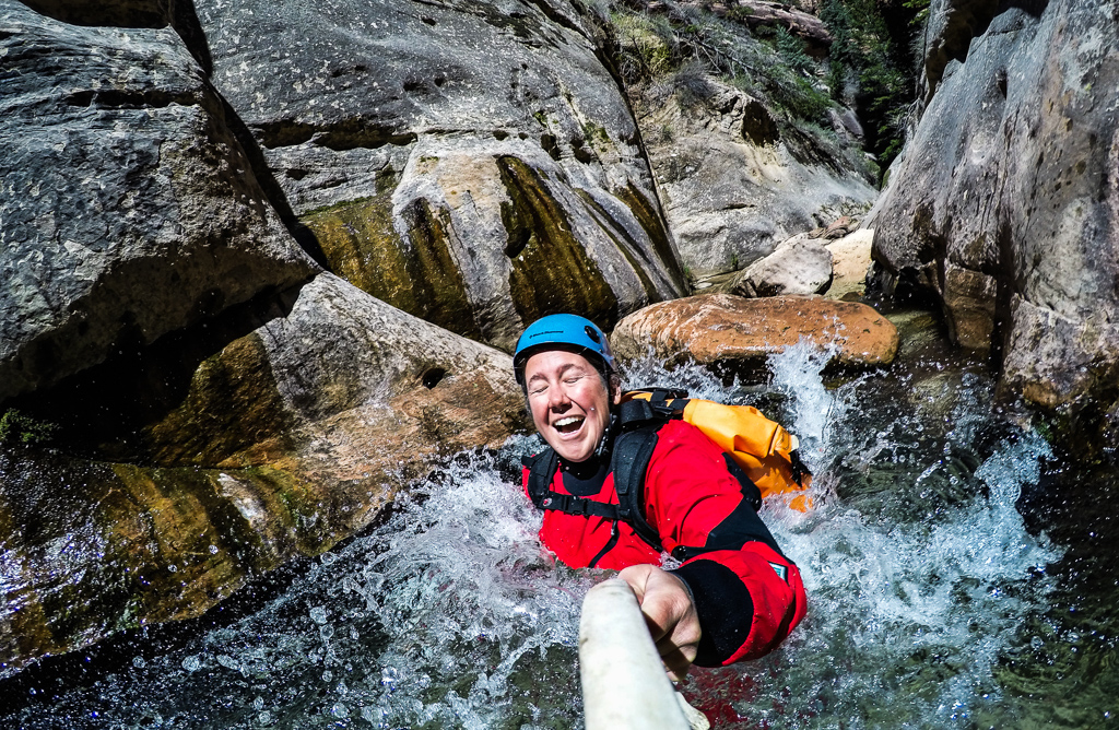 Kathy taking an exhilarating plunge into the icy water of the canyon.