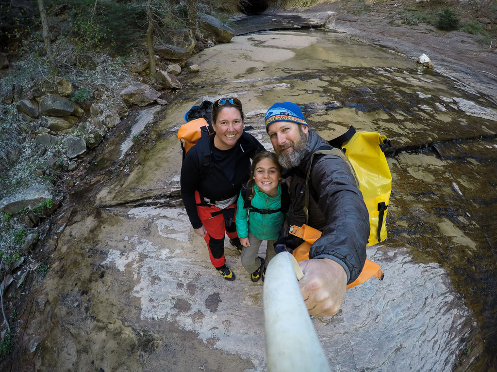 Even with the ambiguous route finding and rugged trail (or lack there of), the first two miles are just the warmup act, with the real challenges awaiting us further down the canyon. As I walk along the canyon floor, I notice a bone lying on the side of the trail. It has been bleached white by the sun, and I think it is probably the rib bone of a deer. I call Abby over to check it out and we decide that with a little duct tape it will make a great tool to attach our GoPro camera, giving us just a little more reach to show the tight quarters of the canyon, an improvised selfie-stick.