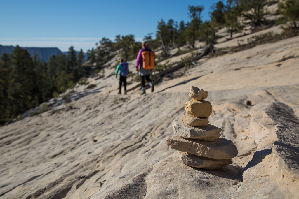 The trail meanders through large conifer trees, rising and falling over ridges across the rugged landscape. At times it fades across vast expanses of ancient petrified sand dunes, punctuated periodically with small, teetering rock sculptures, known as cairns, that mark the path. The route finding is ambiguous at times with multiple trails leading off in different directions, occasionally vanishing completely. We have a rough description of the route in the guide book with vague directions: "look for the rock pinnacle in the saddle, cross the ridge here and then drop into the gorge below". As we look around we are surrounded by pinnacles and gorges and wonder which rock outcrop to aim for. We turn to the right following a faint path and scramble down into a gully. After a few minutes of crawling on all fours down several rocky ledges, we find ourselves walled in on either side with 30 foot cliffs soaring above, and a 100 foot shear drop ahead. We have reached a dead end. We retrace our steps, back to the last obvious cairn and search for the correct trail.