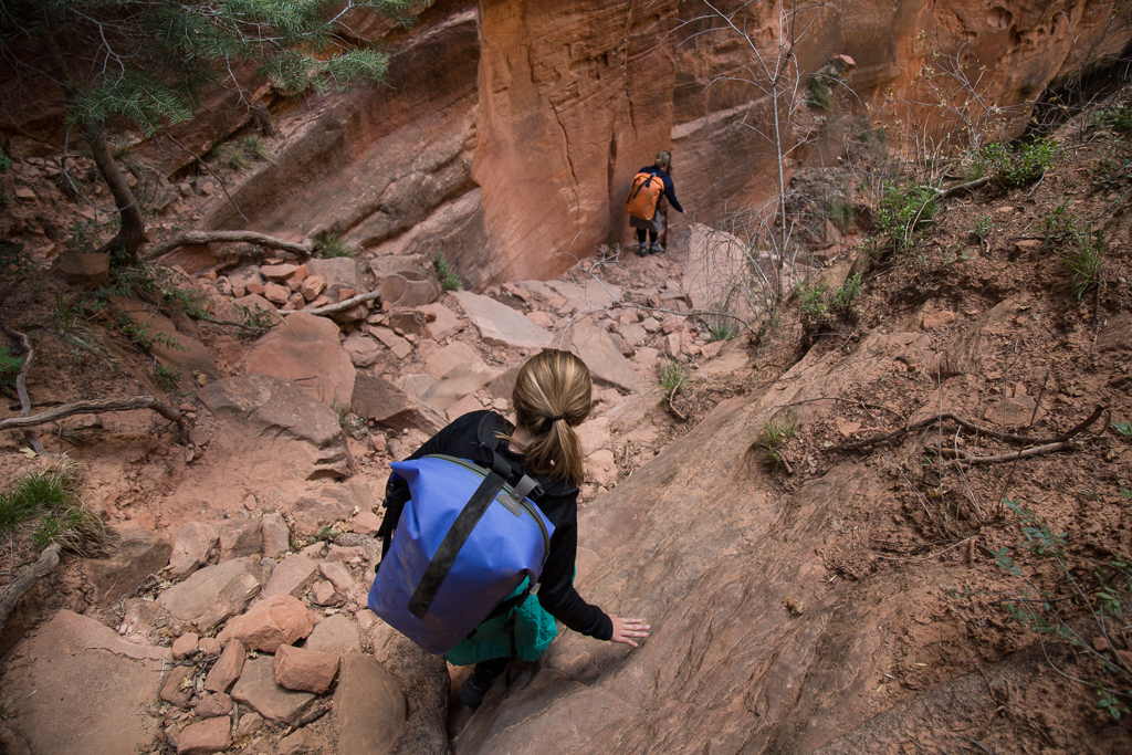Abby and Kathy scrambling up a weakness in the gorge as they make the final ascent out of the canyon.