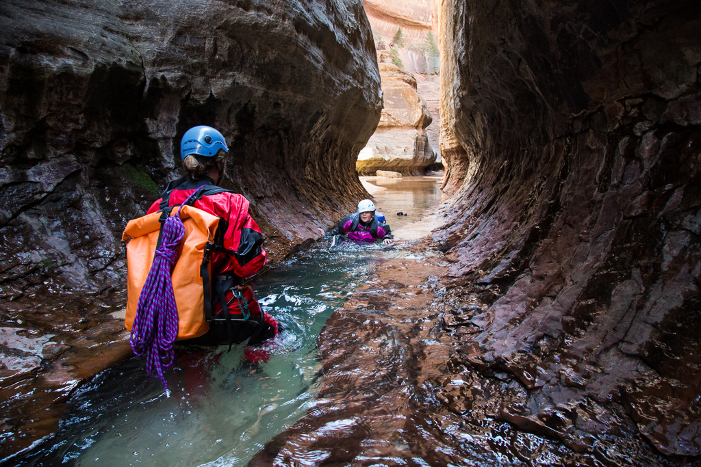 The other party moves quickly ahead as we coil our rope, and as we continue down the canyon, we find ourselves alone again. The canyon narrows so much that with our arms extended we can touch the towering cliff walls on either side. The river running through the canyon is now unavoidable and we are thankful for the warmth of our dry suits as we plunge into the icy water for the first time. We frolic through the undulating slot canyon, joyful with anticipation for what lies around the next bend: an icy plunge into a crystalline pool, a rappel down a blocky jumble of rocks, a channel carved deeply into the canyon floor. We face a steady barrage of one glorious experience after another as we press on through the gorge. Even with the protection afforded by our drysuits, eventually the cold begins to seep through and we find ourselves shivering in the damp, shadowy chambers, and wondering how the scantily clad party ahead of us is faring.