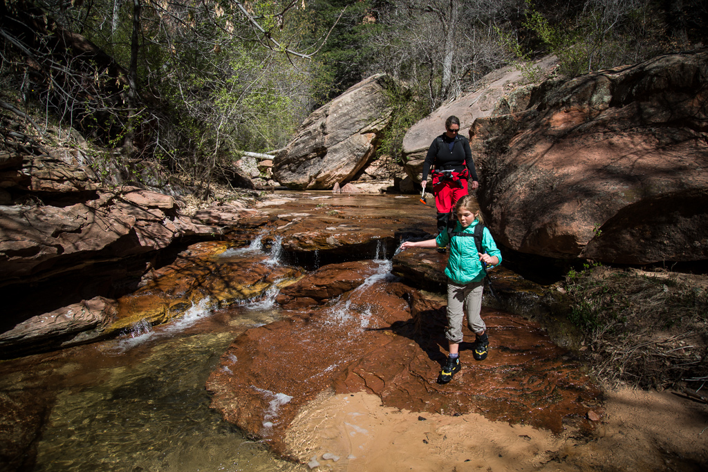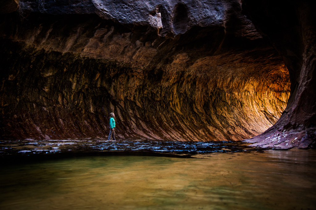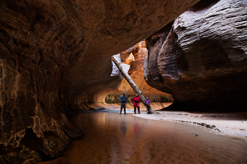 It is obvious where the name comes from: the rounded tunnel formation with striations that mimic the tile often found lining station walls coupled with a beam of light emanating from a bend in the cavern, give the impression of a subway tunnel with an oncoming train. Abby and I run ahead to explore the surreal tube, splashing through the puddles racing ahead to see what awaits around the corner. Abby discovers that at some point a warm springs has entered the canyon transforming a series of flooded potholes into miniature natural hot tubs. Peter lingers behind taking in the beauty through his photographer's eye. It is the perfect spot for an afternoon lunch break.