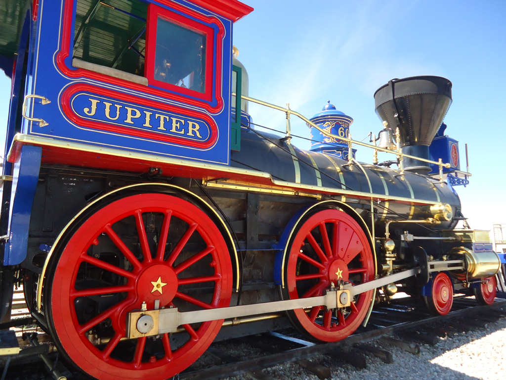 On that day in May (142 years ago), two locomotives (Union Pacific No. 119 and Central Pacific No. 60) were drawn up face-to-face and separated only by the width of a single railroad tie. In front of hundreds of onlookers, Leland Stanford used a silver spike maul to drive the very last spike (made of 17.6-karat copper-alloyed gold) into a pre-drilled hole. The ceremonial spike was quickly replaced by an ordinary iron spike, and a message was transmitted by telegraph to both coasts. It simply read: "DONE."
