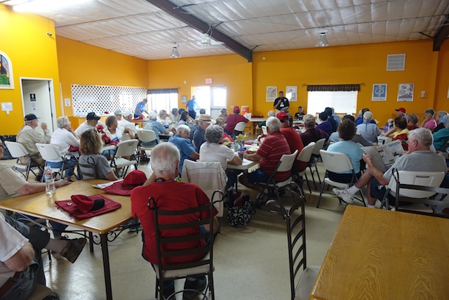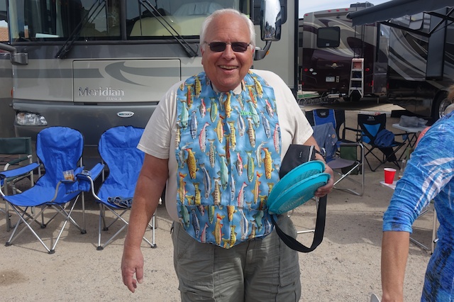 Our four hosts organized a shrimp boil where they provided the great (and large) local shrimp and the rest of us brought salads or deserts. A long line of portable camping tables was extended with a white plastic table cloth (fully anticipated by our hosts) which was stretched over 25 feet and bedecked with a great selection of homemade and, in a few cases, home (in-rig) baked items.