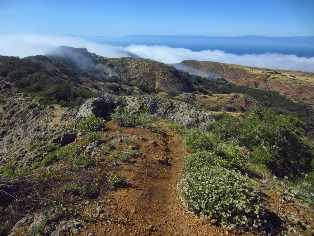 I enjoy long, slow hikes roaming across the grassy rolling hills, wandering along the paths that cling close to the cliff's edge, and hike up above the low lying clouds roiling over the hilltops like billowing smoke from a block of dry ice. I could walk for days across this island, taking in the change of flora and fauna, from the golden grain grasses left behind by the sheep farmers, their tassels swaying in the sea breeze, through the scrub oaks, home of the endemic Island Scrub Jay found nowhere else on earth.